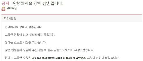 잼미의 아이디로 고인의 트위치에 접속한 네티즌이 커뮤니티 게시판에 글을 올려 잼미의 삼촌이라고 밝히며 “그동안 경황이 없어 알려드리지 못했지만 장미는 스스로 세상을 떠났다. 장미는 그동안 수많은 악성댓글과 루머 때문에 우울증을 심각하게 앓았었고 그것이 원인이 됐다”고 밝혔다.