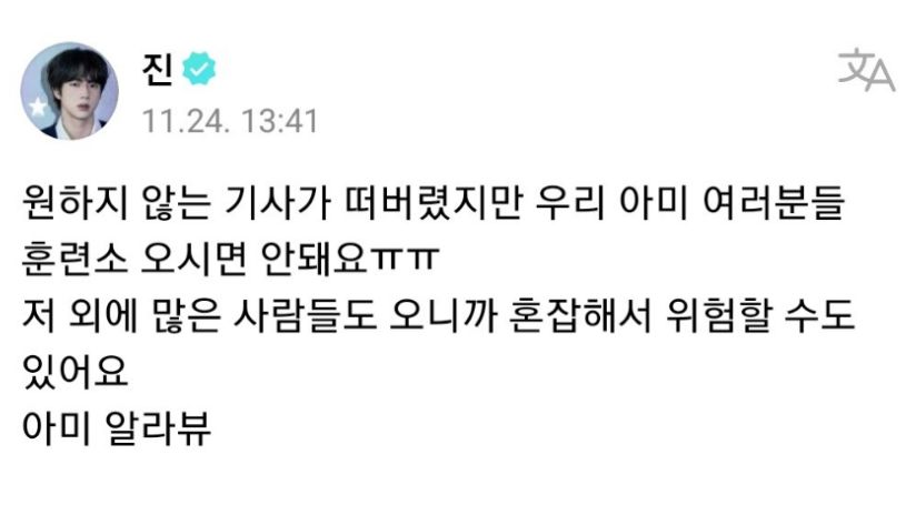 진은 지난 24일 위버스를 통해 "원하지 않는 기사가 떠버렸지만 우리 아미 여러분들 훈련소 오시면 안 돼요."라고 전했다. 이어 "저 외에 많은 사람들도 오니까 혼잡해서 위험할 수도 있어요. 아미 알라뷰."라고 덧붙였다.