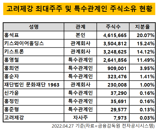 그룹의 ‘몸통’에 해당하는 고려제강은 이미 오너 3세 홍석표 전략기획본부장 사장이 아버지 홍영철 고려제강그룹 회장을 제치고 최대주주에 올랐다.