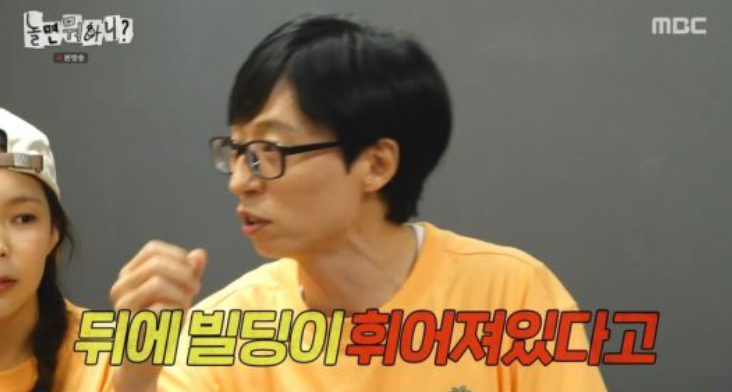 유재석도 "기사도 났다. 옷 좀 입어라"라고 핀잔을 주면서 "어떤 분이 뒤에 빌딩 휘어져 있다고 하더라"라고 말해 웃음을 자아냈다.