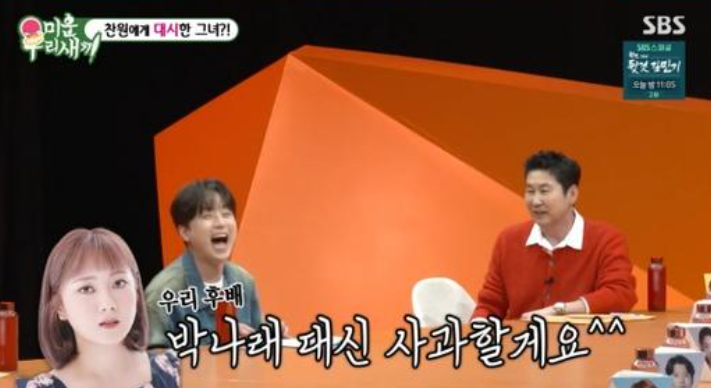 이찬원이 "연예인?"이라고 묻는 신동엽의 질문에 "연예인"이라고 답하자, 신동엽은 "제가 박나래 대신 사과하겠다"고 재치 있게 받아쳐 웃음을 자아냈다.