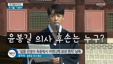 | 윤봉길 의사 후손 '윤주빈' 3.1절 기념식서 편지 낭독 "할아버지의 뜻 기억하며 살 것" (0) | 2019.03.01 |